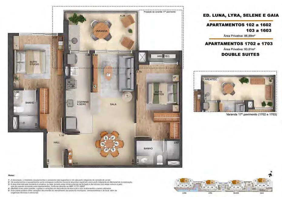 4 edifícios: Luna, Lyra, Selene e Gaia, com 16 pavimentos tipo, sendo: 2 quartos de 86,78 m² a 93,80 m²Double suites de 86,89 m² a 93,61 m²